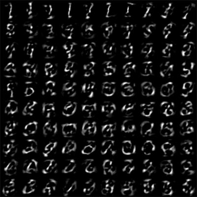 The above tiles are the images represented by each one-hot encoded vector (e.g. [0,0,….,X,….0]), and are useful to visualize the kind of forms the network is learning. This illustrates the patterns detected at layer 1 of the autoencoder for the MNIST dataset.