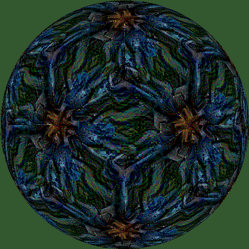 Now that we can paint a sphere, can we do something like the Kaleidoscope effect, but rotating in three dimensions? It turns out we can! For a reason similar to the regular tiling of the infinite plane problem discussed above, it turns out that only some setups of this symmetry work out. These setups are known as rotational groups in mathematics. Skipping the mathematics, I have prepared 3 setups using rotational groups. These are structurally equivalent to the tetrahedron, octahedron, and icosahedron. An interesting side effect of producing a texture with rotational symmetry is that less views are needed, and we may be able to see the entire tile in a single view. Thus, the generation process can be much faster.