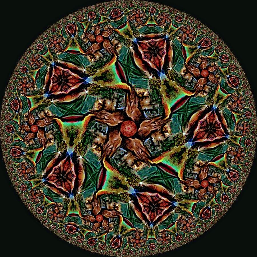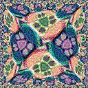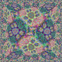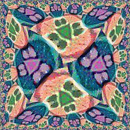 Some other symbols emerge recurrently, though. Some are indicative of the texture being used, and others can be encouraged by symmetry constraints. In particular, when 4-, 5-, or 6-fold rotational symmetry is used without color permutations, emergent symbols include swastikas, pentagrams, and stars of david, respectively. A good way to prevent this is to introduce a color permutation. A note of cultural sensitivity: The swastika, which is used by many cultures but is marred by the events surrounding WWII, should always be displayed such that the counterclockwise pointedness is dominant (卍). This is actually a sauwastika, not a swastika. Even still, display sparingly.