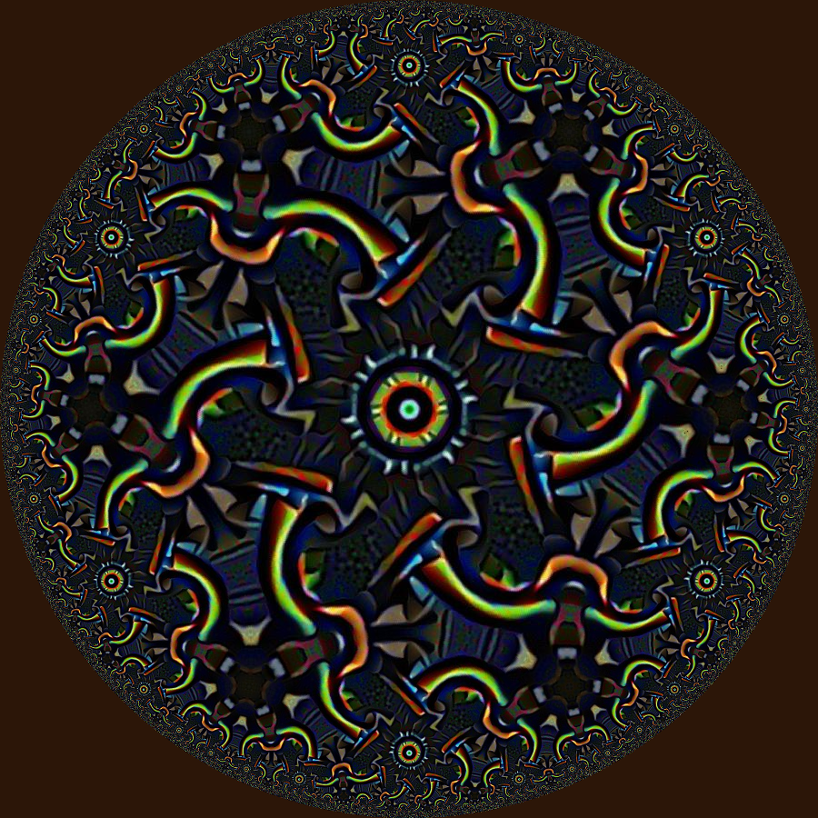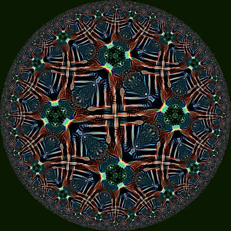 I’d like to point out some features of the way we are packing all of this into a circle. This is known as a Poincare disk, and it is a well-studied mathematical representation of hyperbolic space. I don’t want to get into the details of projective geometry, but suffice it to say that this representation preserves angles but distorts distances and areas. Therefore, the repeating vertices in the image I’ll have the same angular symmetry, although they are smaller and more compact near the edge. This gives the representation a sort of global consistency and aesthetic. Another property of this representation that adds to the aesthetic appeal is that all straight lines form circles which intersect the boundary circle perpendicularly. Since a lot of tiling patterns produce infinite straight lines, the Poincare disk representation shows these lines as neatly arranged circles.