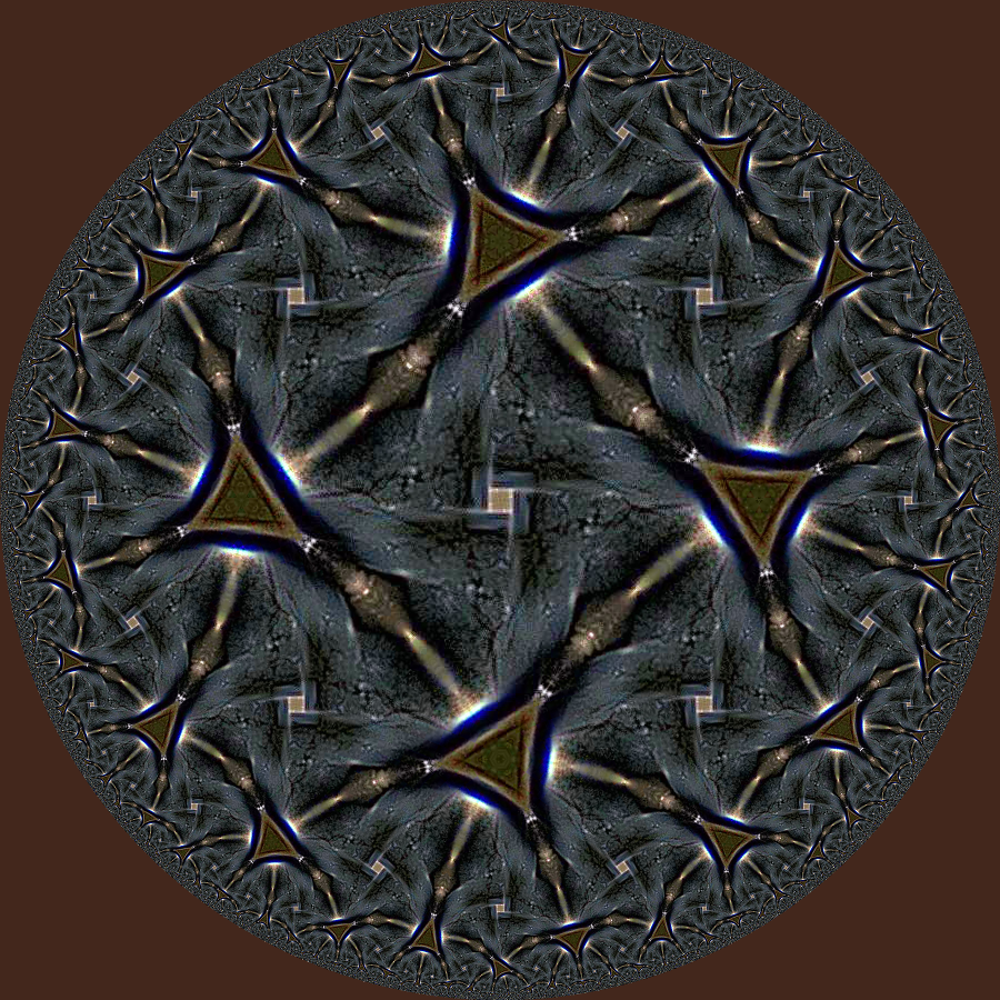 Hyperbolic space is really weird, and I do not intend to dive into the mathematics of it nor do I pretend I can explain it simply. So I’ll just call it “magic” and point out a few cool things about it. First, the main reason we care about hyperbolic space here is that it permits some very unique tiling behaviours that compliment the ones we’ve already explored. Symmetric tiling is what causes the interesting geometric properties of hyperbolic space to become visible.